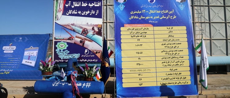 خط انتقال یک هزار و ۳۰۰ میلیمتری طرح «آبرسانی غدیر» به شهرستان شادگان توسط قرارگاه خاتم الانبیا طی مدت ۲۴ ماه اجرا شده است.با افتتاح این طرح ۱۰۶ هزار و ۲۳ نفر جمعیت شهری و همچنین ۱۱۵ هزار و ۵۱ نفر جمعیت روستایی در افق ۱۴۱۵ تحت پوشش قرار میگیرند.تعداد روستاهای تحت پوشش این طرح ۱۹۰ و میزان تأمین آب از طرح غدیر نیز ۱۳۵ هزار مترمکعب در شبانهروز است.